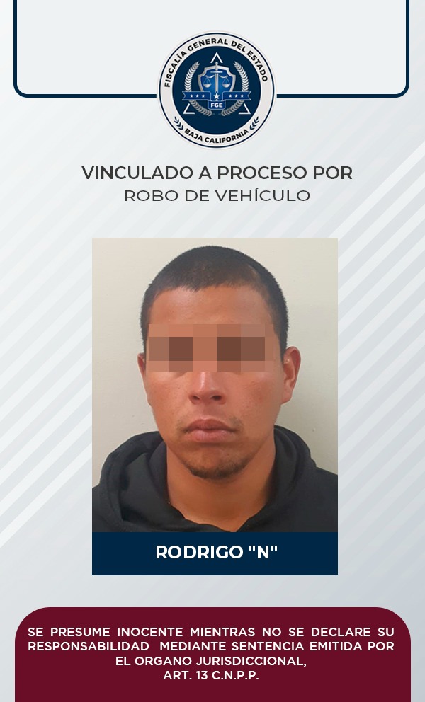 TIJUANA, B.C. Derivado de las pruebas recabadas y presentadas por la Fiscalía Regional de Tijuana, ante un Juez de Control, fue posible lograr la vinculación a proceso de Rodrigo “N”, por el delito de robo equiparado de vehículo de motor robado (usar vehículo de motor robado).