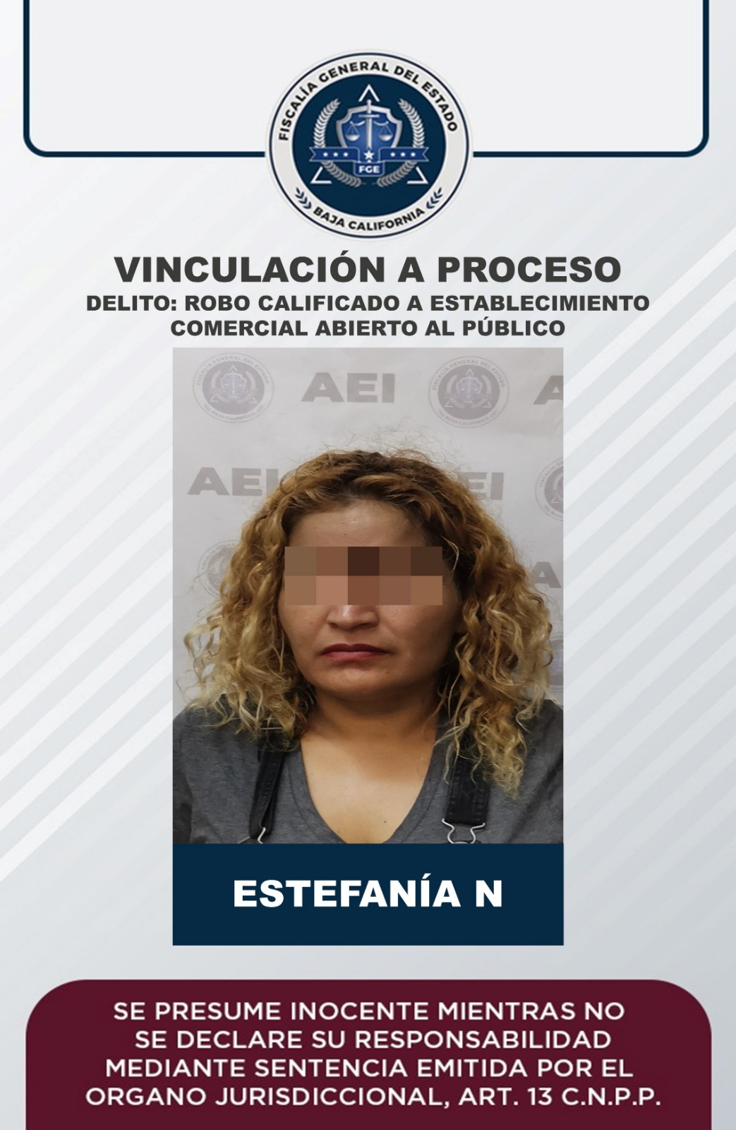 ENSENADA, B.C. Derivado de la labor realizada por la Unidad de Investigación de Robos, de la Fiscalía Regional de Ensenada, se logró auto de vinculación a proceso en contra de Estefanía “N”, por el delito de robo calificado a establecimiento comercial abierto al público.