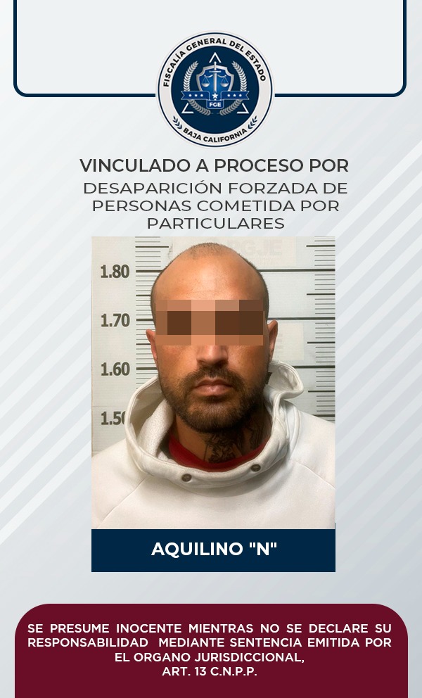 PLAYAS DE ROSARITO, B.C. Con el sustento de los datos de prueba aportados por el Ministerio Público, la Fiscalía General del Estado, obtuvo de un juzgador la vinculación a proceso de Aquilino “N”, por el delito de desaparición forzada de personas cometida por particulares.