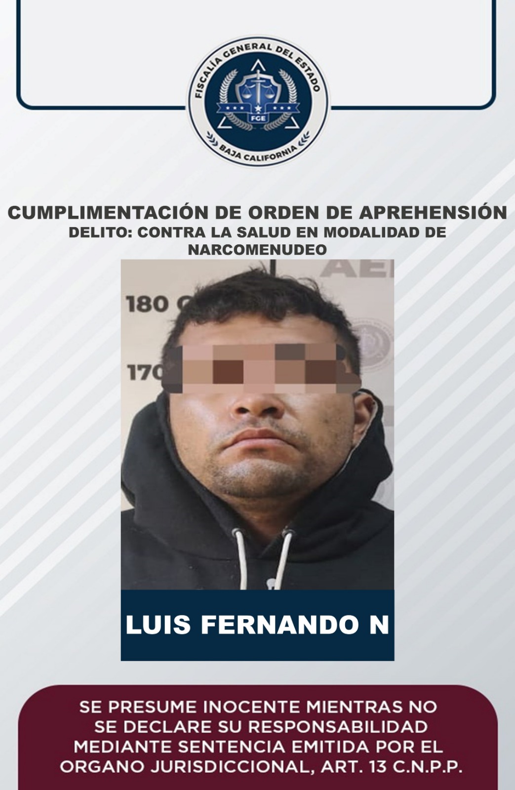 ENSENADA, B.C. Elementos de la Fiscalía General del Estado capturaron a Luis Fernando “N”, de 27 años de edad, sobre quien pesaba una orden de aprehensión por delitos contra la salud en modalidad de narcomenudeo en variante de posesión simple de marihuana.
