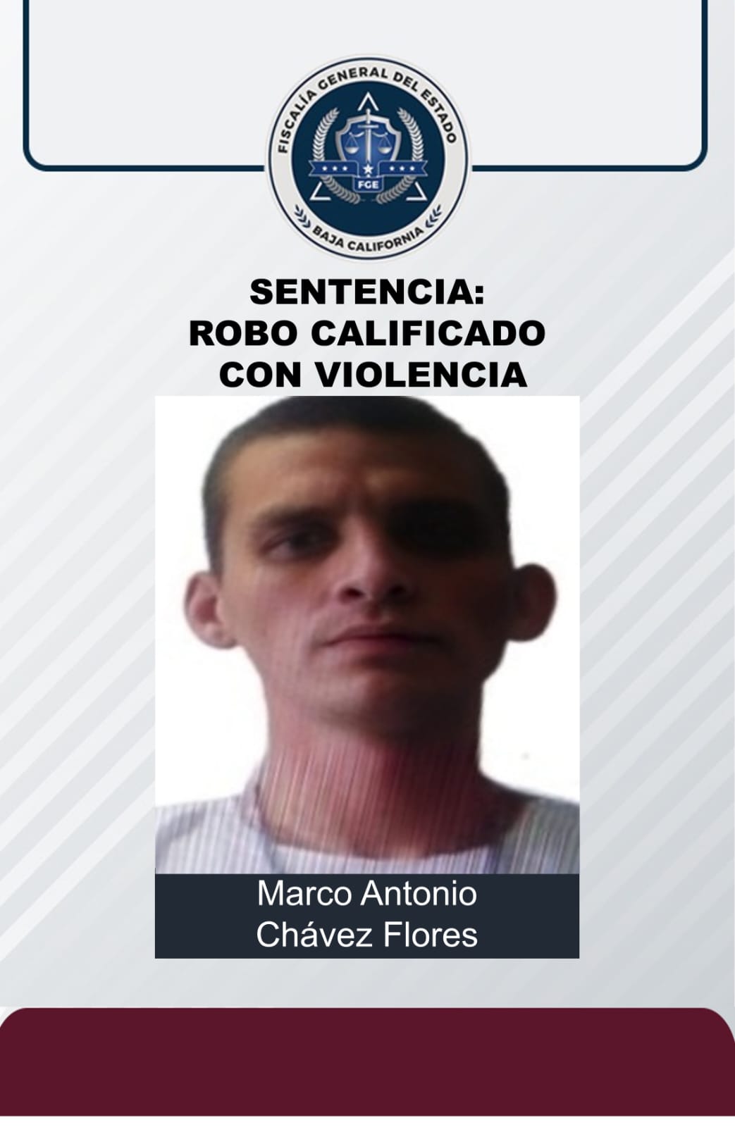 ENSENADA, B.C. La Fiscalía Regional de Ensenada logró sentencia condenatoria contra Marco Antonio Chávez Flores, quien es penalmente responsable del robo con violencia sucedido el 14 julio de 2021 en una tienda Oxxo de la colonia Industrial.