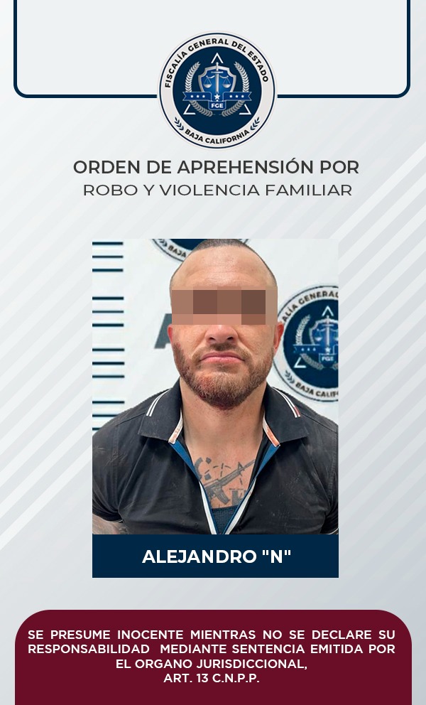 MEXICALI, B.C. La Fiscalía General del Estado (FGE), a través de elementos de la Agencia Estatal de Investigación aseguraron a Alejandro “N”, a quien le cumplimentaron mandamientos judiciales por los delitos de robo calificado a casa habitación y violencia familiar.