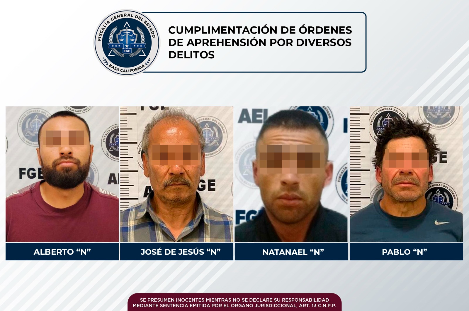 TIJUANA, B.C. Como resultado de acciones efectuadas por elementos de la Agencia Estatal de Investigación, la Fiscalía General del Estado, obtuvo y logró la cumplimentación de mandamientos judiciales por diversos delitos que derivó en la aprehensión de cuatro hombres.
