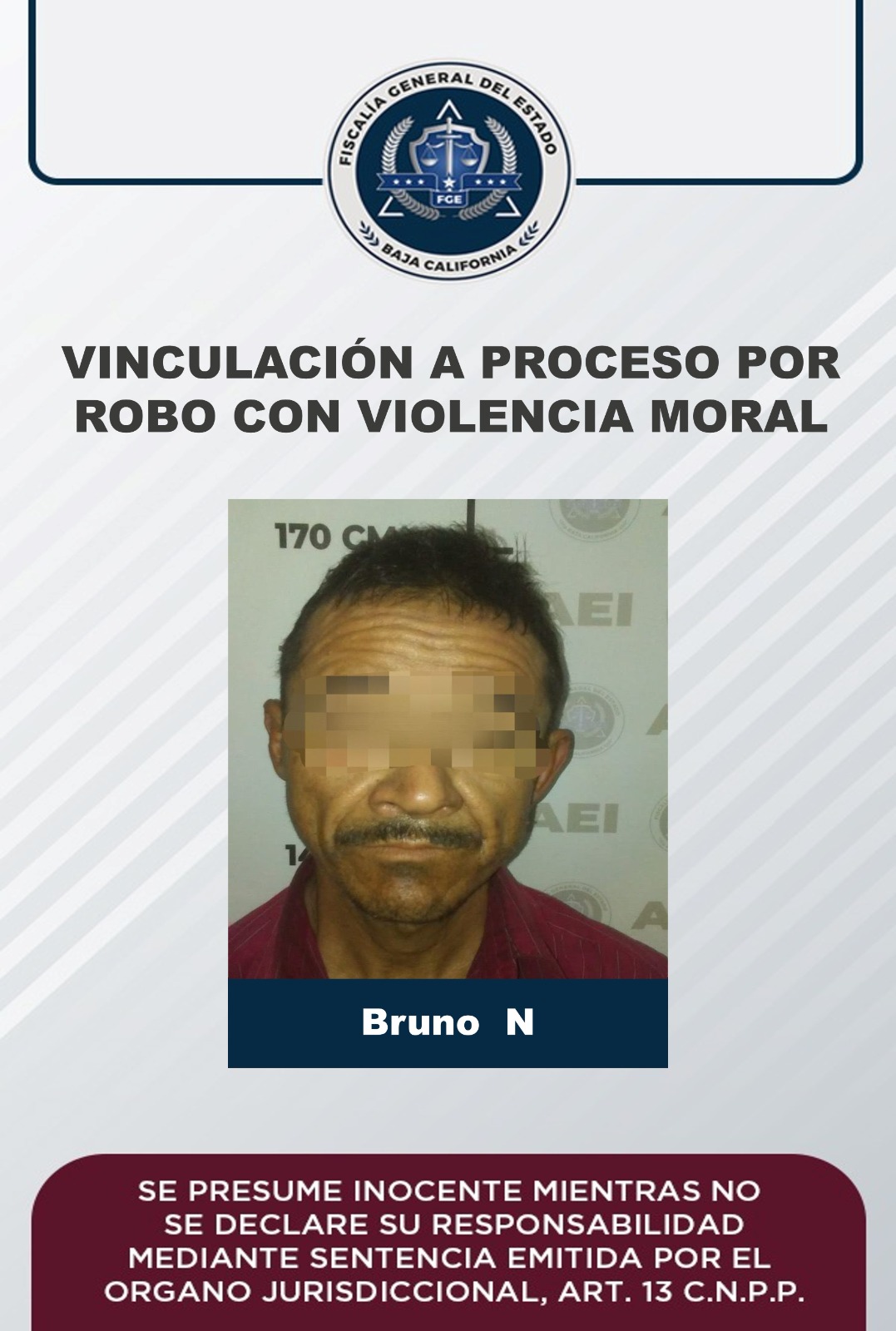 MEXICALI, B.C. La Fiscalía Regional de Mexicali, a través de la Unidad de Investigación de Delitos con Detenido Oriente, obtuvo la vinculación a proceso en contra de Bruno “N” por el delito de robo con violencia moral.