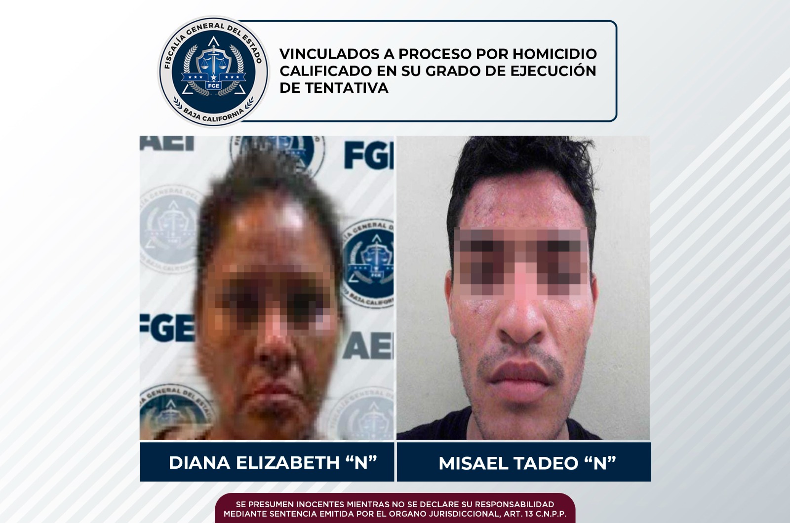 TIJUANA, B.C. Un hombre y una mujer iniciaron proceso penal por el delito de homicidio calificado en su grado de ejecución de tentativa, una vez que la Fiscalía General del Estado, a través de la Fiscalía Especializada en Delitos Contra la Vida, recabó los elementos probatorios que fueron suficientes para acreditar la presunta responsabilidad de ambos en un mismo hecho que se les atribuye.