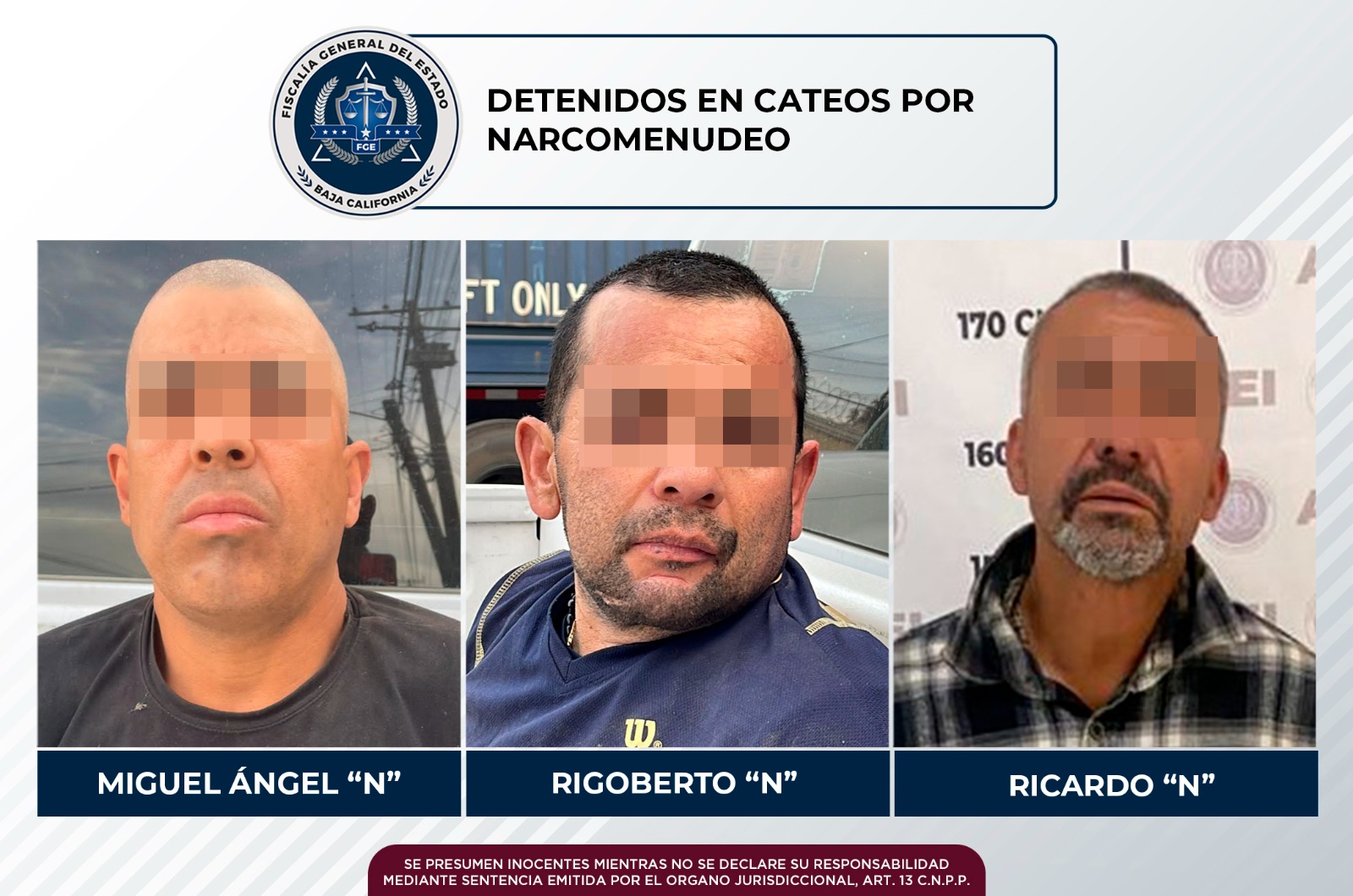 TIJUANA, B.C. 16 DE FEBRERO DE 2023.- La Fiscalía General del Estado, a través de la Fiscalía Especializada en Narcomenudeo, detuvo a tres hombres por su probable responsabilidad en delitos contra la salud, esto como resultado de dos cateos realizados, en días recientes, en los municipios de Tijuana y Playas de Rosarito.