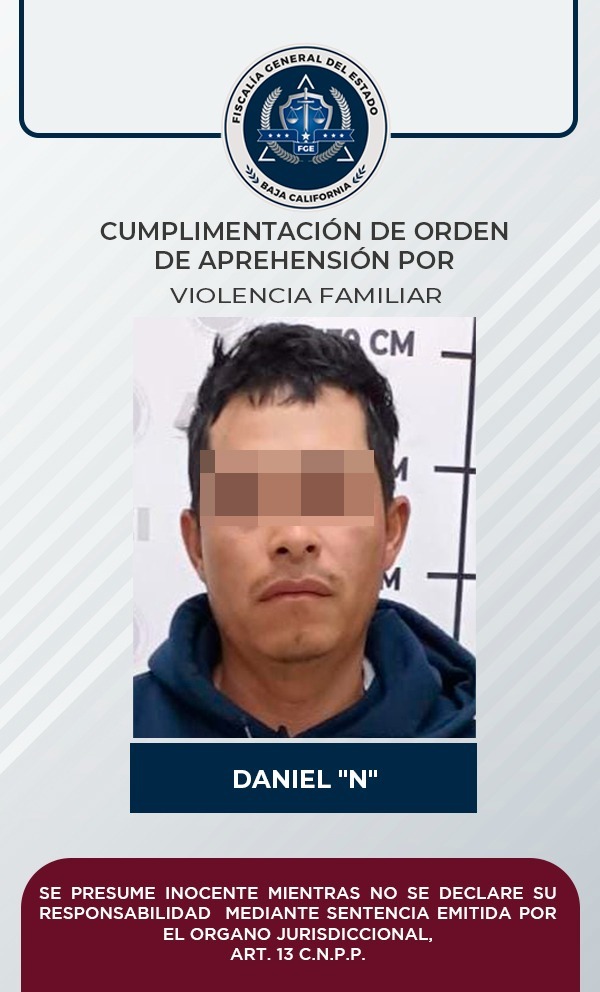 MEXICALI, B.C. La Fiscalía Regional de Mexicali, a través de Agentes Estatales de Investigación, lograron la captura de Daniel “N”, quien contaba con una orden de aprehensión por su presunta responsabilidad en el delito de violencia familiar.