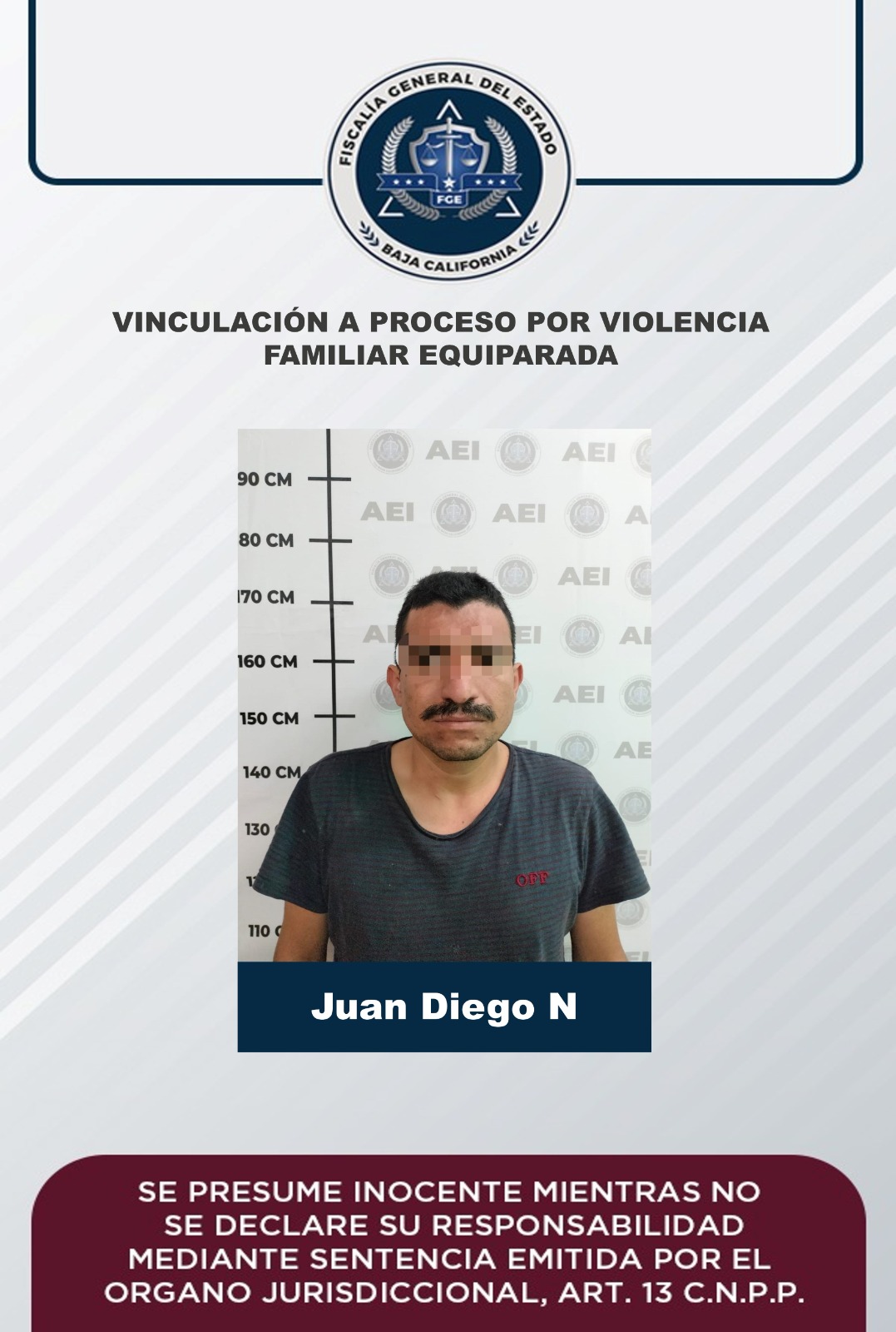 MEXICALI, B.C. La Fiscalía Regional de Mexicali, logró la vinculación a proceso penal de Juan Diego “N” por el delito de violencia familiar, como resultado de la integración de las carpetas de investigación a cargo de la Unidad de Investigación con Detenidos Oriente.