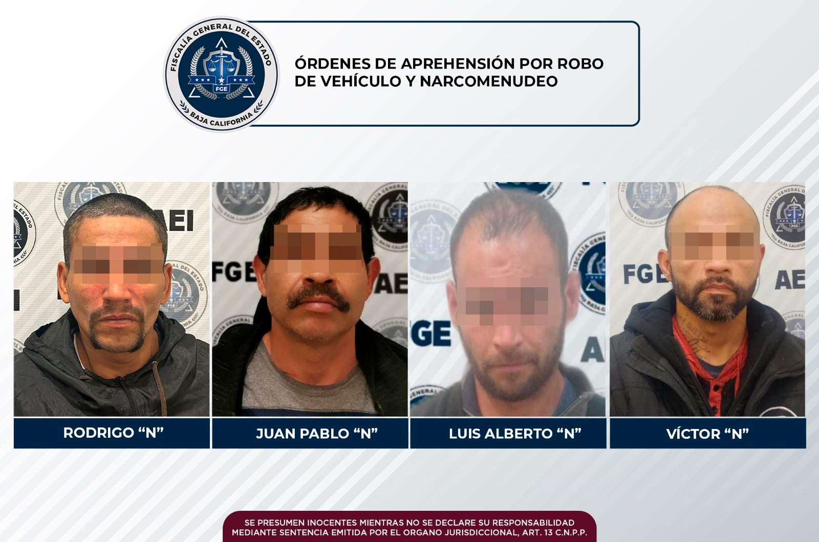 Por el mismo delito, al de nombre Luis Alberto “N” le fue cumplimentada una orden de arresto en el fraccionamiento José Sandoval, en Tijuana; los agentes aprehensores llevaron a cabo su puesta a disposición ante la autoridad judicial que ordenó su captura.