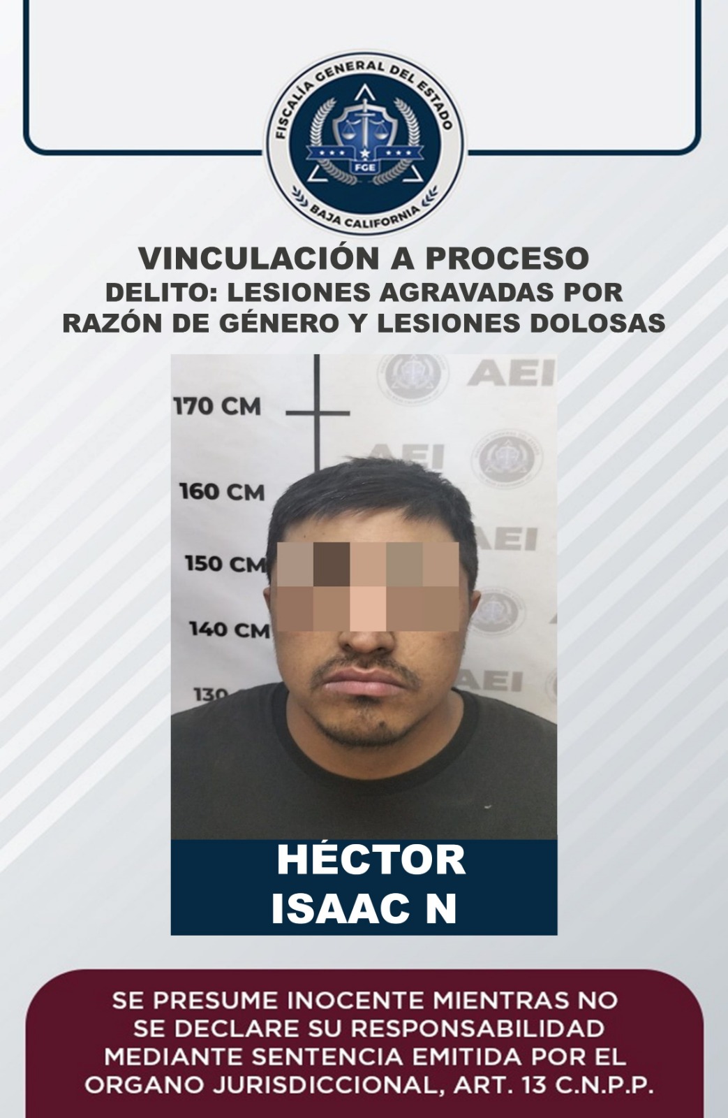 ENSENADA, B.C. La Fiscalía Regional de Ensenada, a través de datos de prueba expuestos por el Ministerio Público, logró auto de vinculación a proceso en contra de Héctor Isaac “N”, quien permanece en prisión preventiva, por los delitos de lesiones agravadas por razón de género y lesiones dolosas.