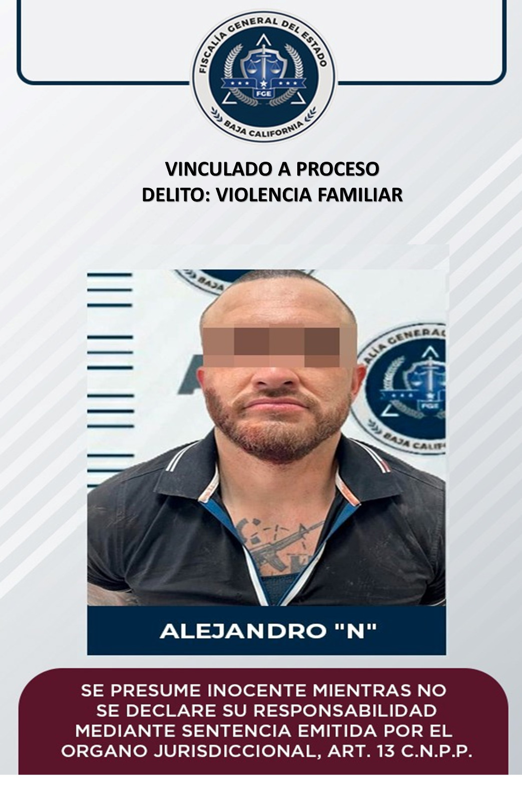 MEXICALI, B.C. 21 DE FEBRERO DE 2023.- La Fiscalía General del Estado (FGE) a través de la Fiscalía Especializada en Delitos Contra Mujeres por Razón de Género, logró que el Juez inicie proceso penal en contra de Alejandro "N” acusado por el delito de violencia familiar.