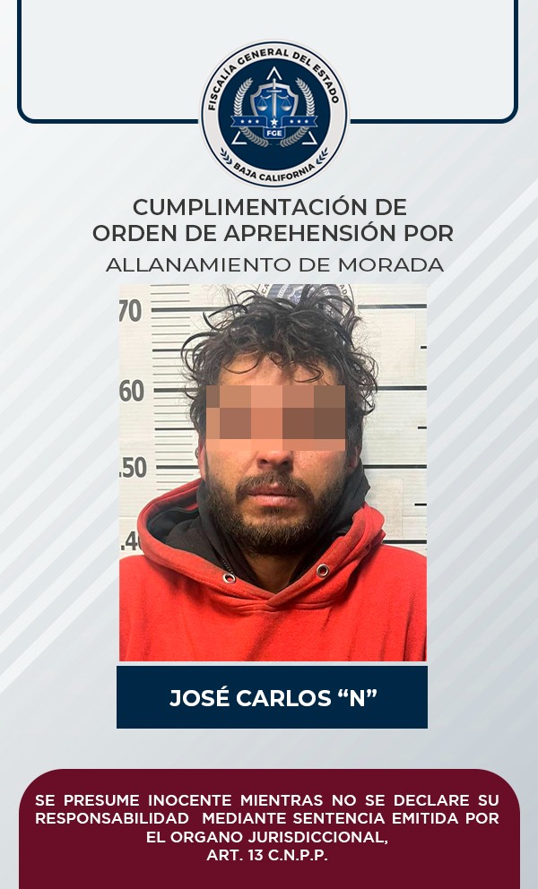 Una vez autorizado el mandamiento judicial por parte de un Juez de Control, el Grupo de Especializado en Aprehensiones, procedió a cumplimentar la orden de aprehensión por allanamiento de morada, en una diligencia ejecutada el pasado 17 de febrero, a las 18:47 horas, en el fraccionamiento José Sandoval de Tijuana.