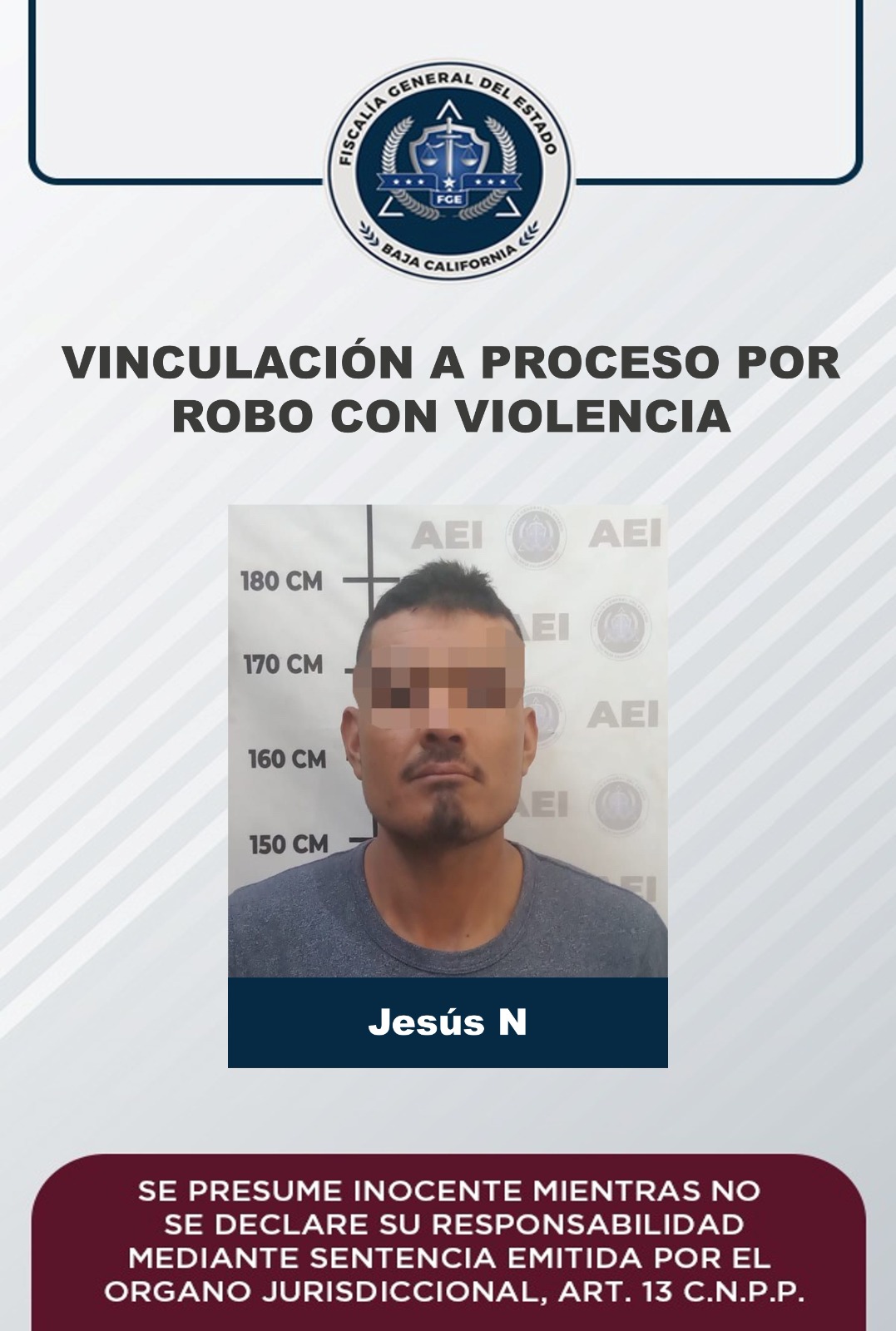 MEXICALI, B.C. La Fiscalía Regional de Mexicali, a través de la Unidad de Investigación de Delitos con Detenido Poniente, obtuvo la vinculación a proceso en contra de Jesús “N” por el delito de robo con violencia.