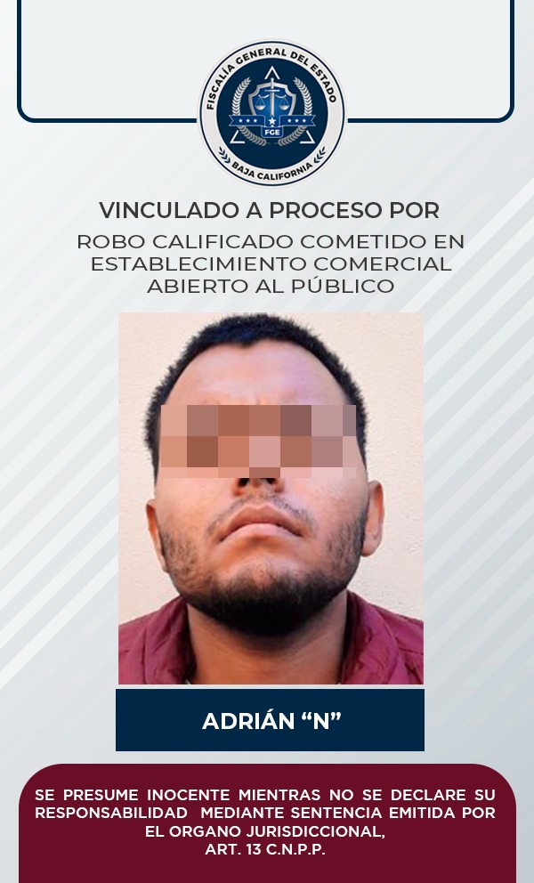 TIJUANA, B.C. Como resultado de diversas acciones de investigación y datos de prueba recabados por la Fiscalía Regional de Tijuana, se obtuvo la vinculación a proceso de Adrián “N”, alias “El Andy”, quien es investigado por la posible comisión del delito de robo calificado cometido en establecimiento comercial abierto al público por una o varias personas armadas ejecutado con violencia.