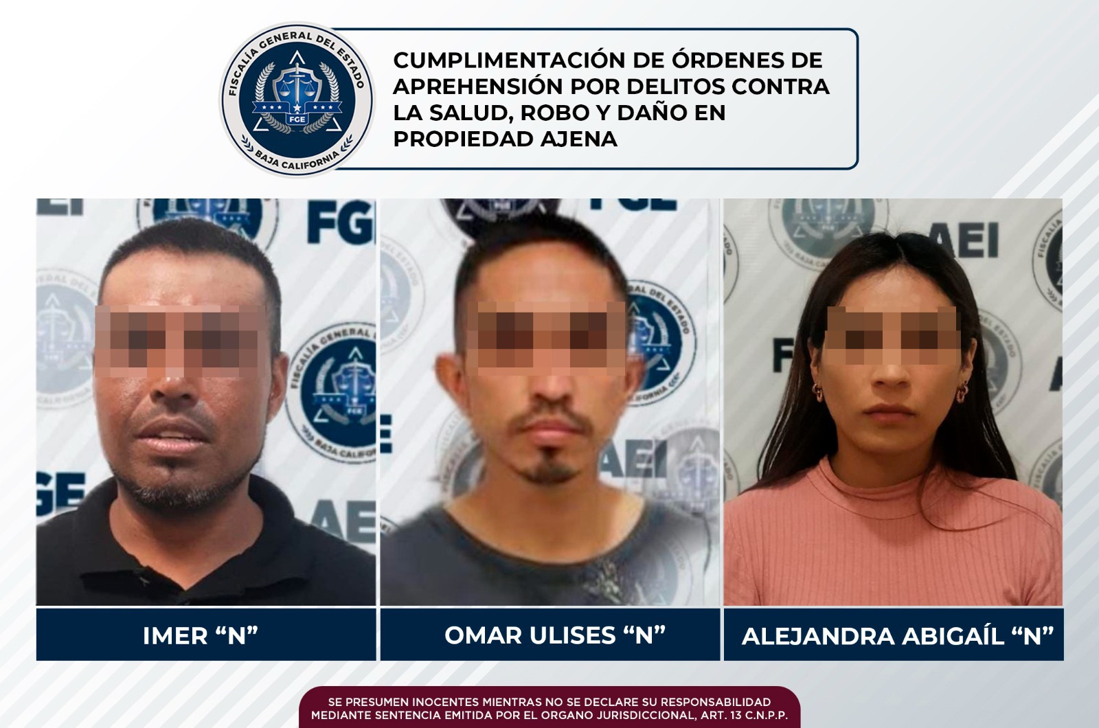 TIJUANA, B.C. Por delitos contra la salud, daño en propiedad ajena y robo calificado, la Fiscalía General del Estado cumplimentó mandamientos judiciales, en diligencias desarrolladas por elementos de la Agencia Estatal de Investigación, en las cuales quedaron aprehendidos dos hombres y una mujer.