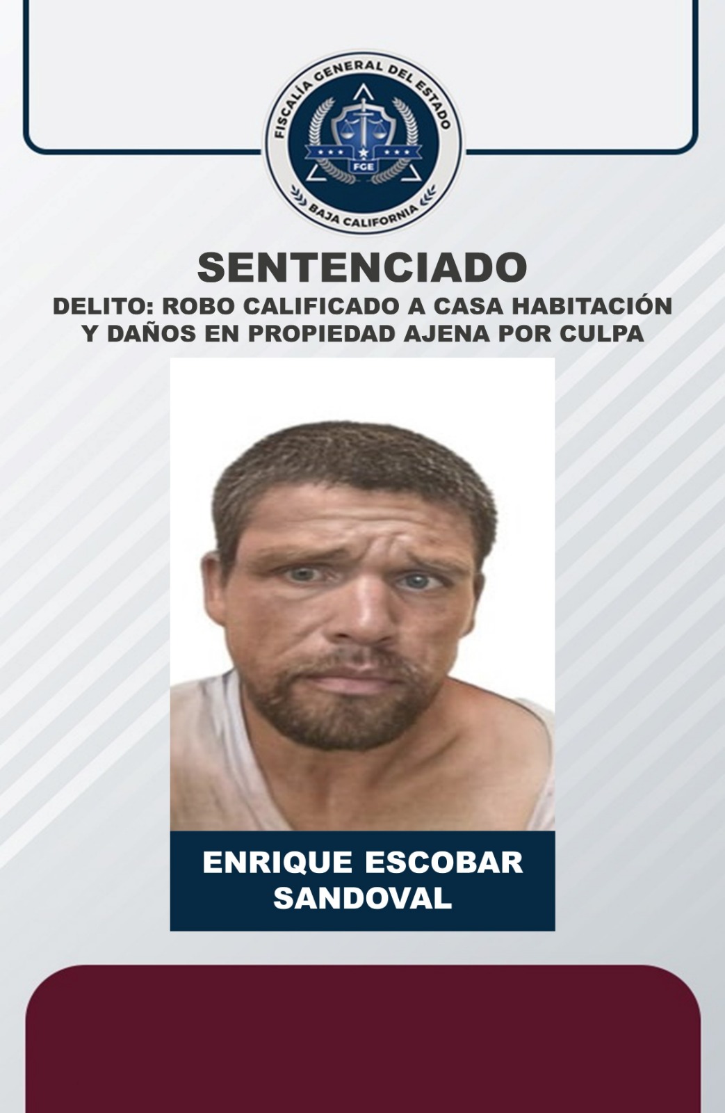 ENSENADA, B.C. Por los delitos de robo calificado a casa habitación y daños en propiedad ajena por culpa, la Fiscalía General del Estado logró sentencia condenatoria en contra de Enrique Escobar Sandoval, mismo que cometió como ilícitos de 2021 en el municipio de Ensenada.