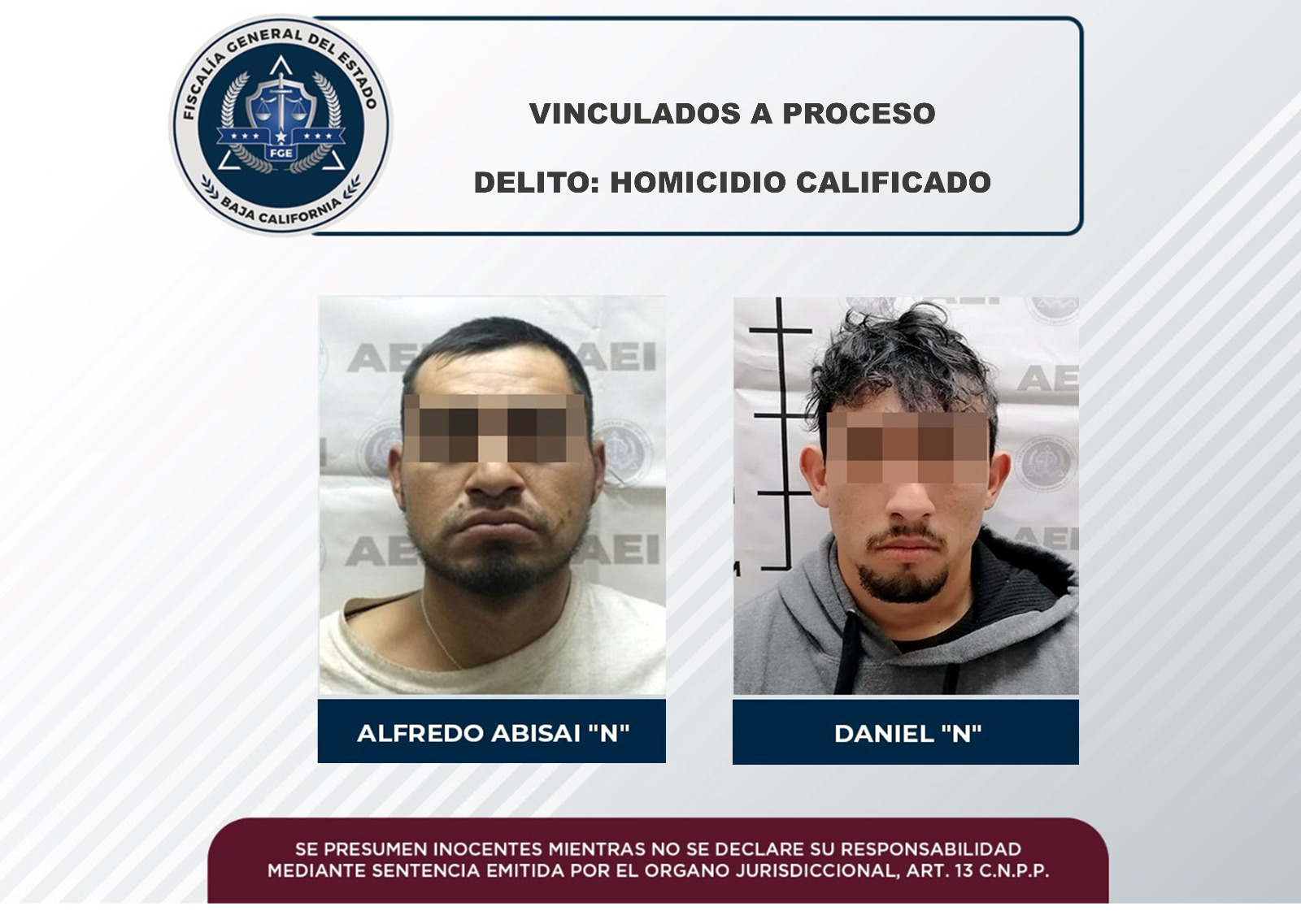 MEXICALI, B.C. La Fiscalía General del Estado (FGE) a través de la Fiscalía Especializada en Delitos Contra la Vida, logró la vinculación a proceso de Alfredo Abisai “N” y Daniel “N”, presuntamente relacionados en la muerte de un hombre de 30 años.