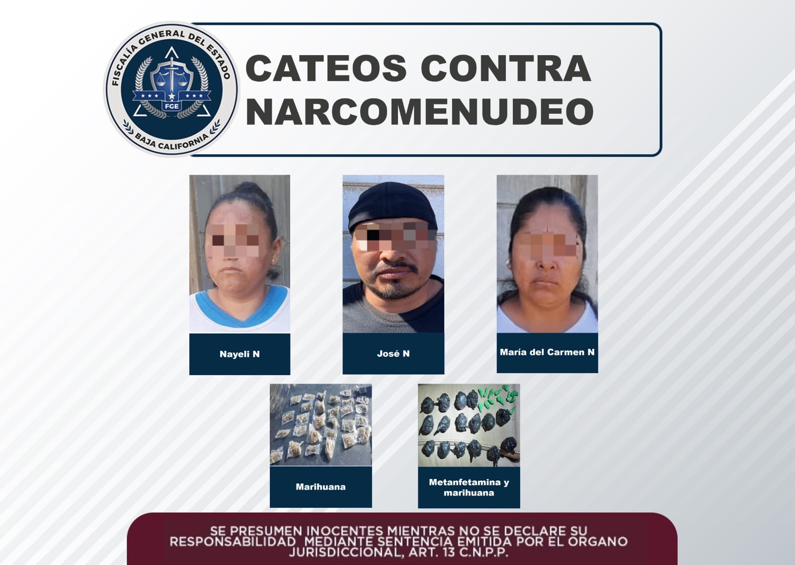 SAN QUINTÍN, B.C. Agentes de la Fiscalía General del Estado lograron la detención de tres personas, el decomiso de drogas y aseguramiento de dos predios, tras cumplimentar de manera simultánea órdenes de cateo en San Quintín.