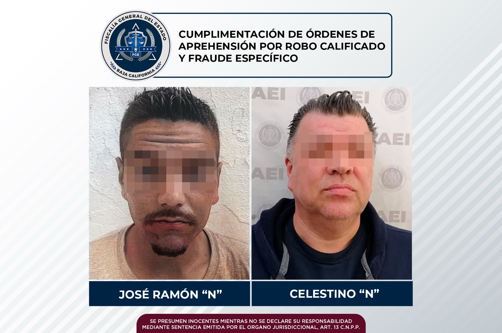 PLAYAS DE ROSARITO, B.C. 25 DE FEBRERO DE 2023.- Elementos de la Fiscalía General del Estado, a través de la Agencia Estatal de Investigación (AEI), cumplimentaron órdenes de aprehensión por los delitos de robo calificado a lugar cerrado y fraude.