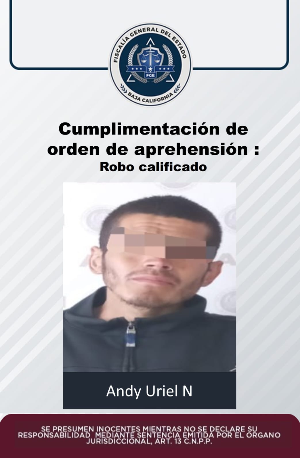 ENSENADA, B.C. Por el delito de robo calificado a establecimiento abierto al público, la Fiscalía General del Estado (FGE), cumplimentó una orden de aprehensión en contra de Andy Uriel “N”, alias “El Chito”.