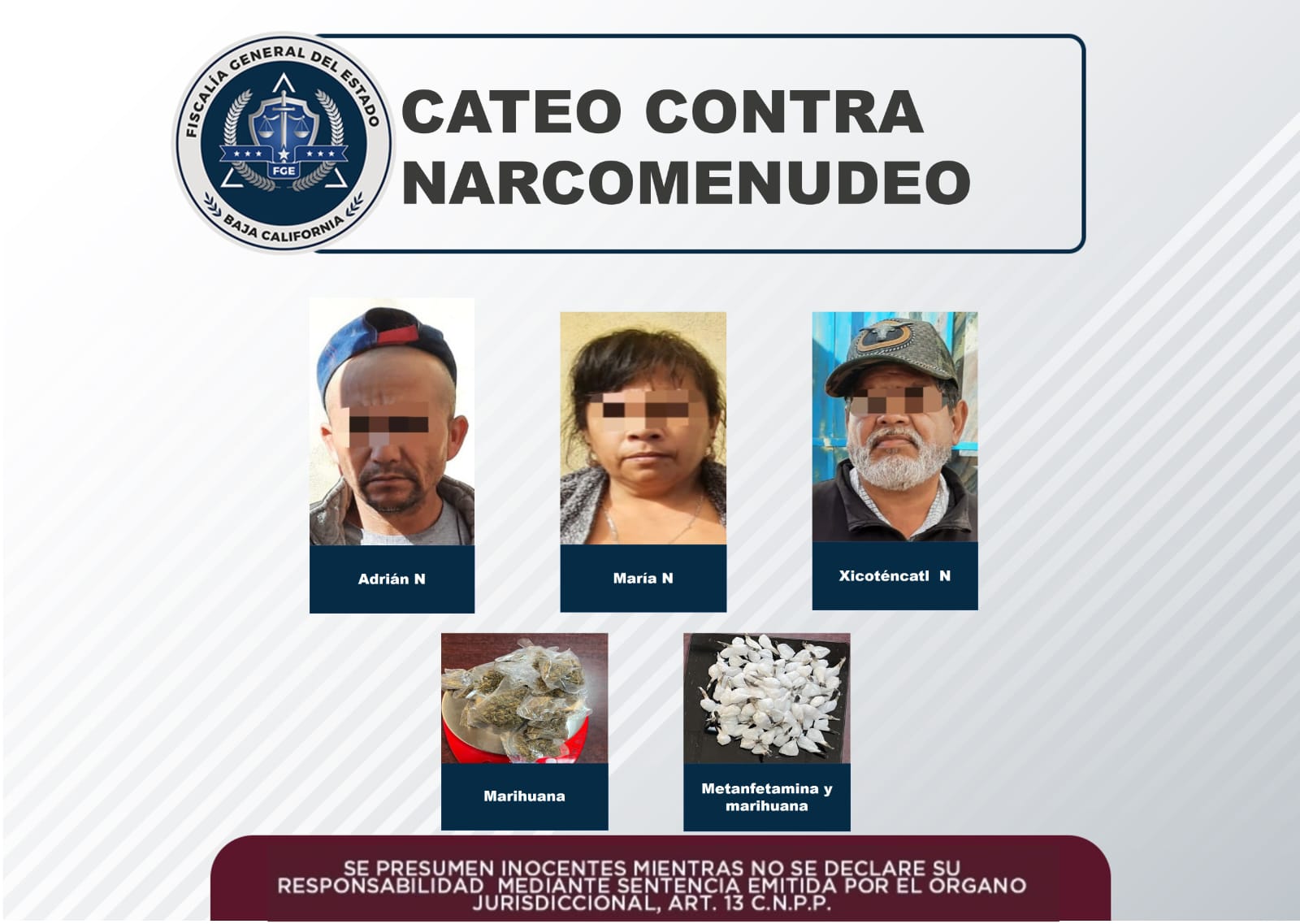 SAN QUINTÍN, B.C. El decomiso de 100 envoltorios con metanfetamina, 13 bolsas con marihuana y la detención de tres personas, entre ellas una mujer, fue resultado de una diligencia efectuada por agentes de la Fiscalía General de Baja California, en el ejido Emiliano Zapata en San Quintín.