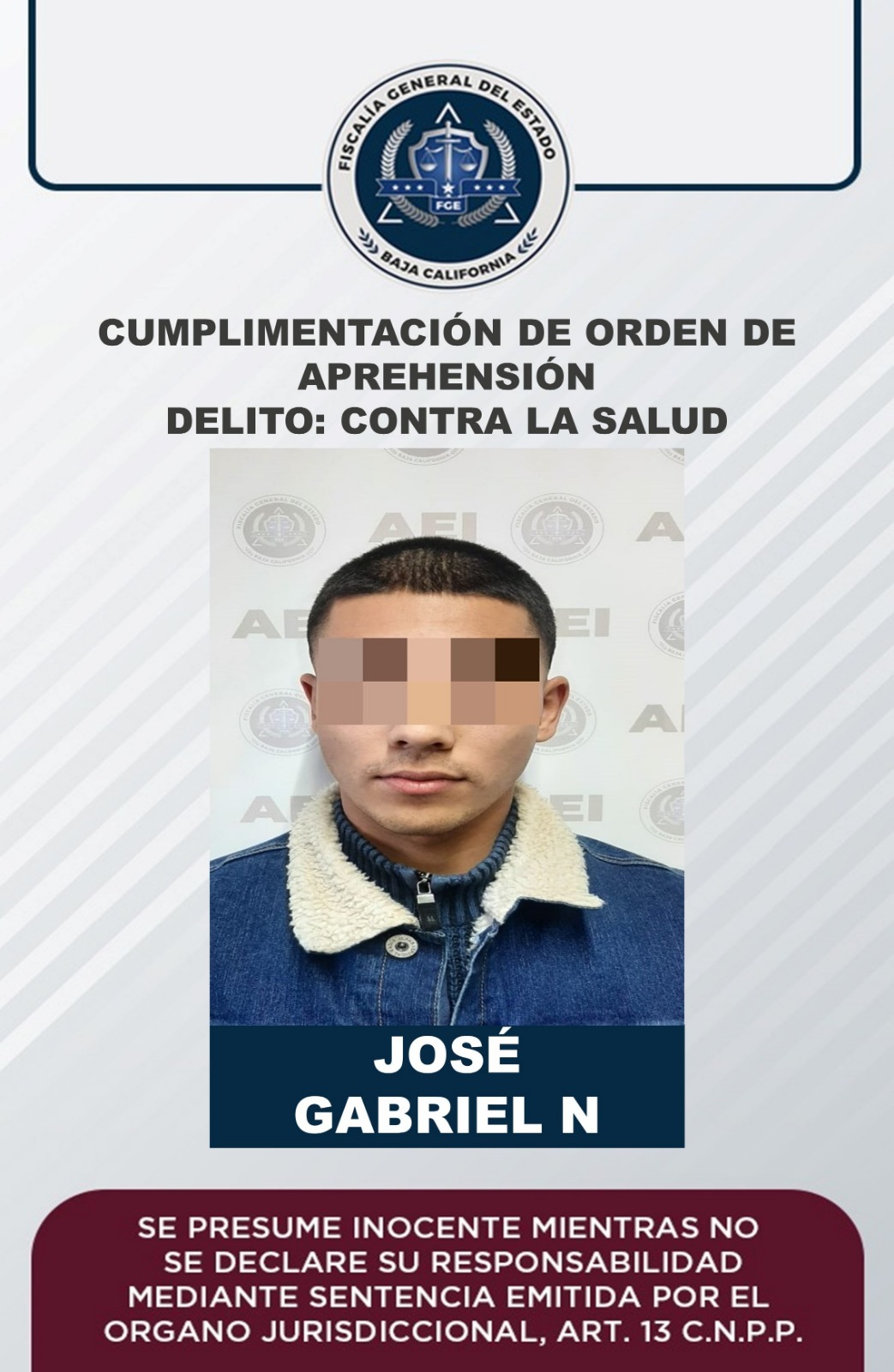 ENSENADA, B.C. Elementos adscritos al Grupo Especializado en Aprehensiones, de la Fiscalía General del Estado (FGE), capturaron a José Gabriel “N”, por el delito contra la salud en su modalidad de narcomenudeo en la hipótesis de posesión de cocaína.
