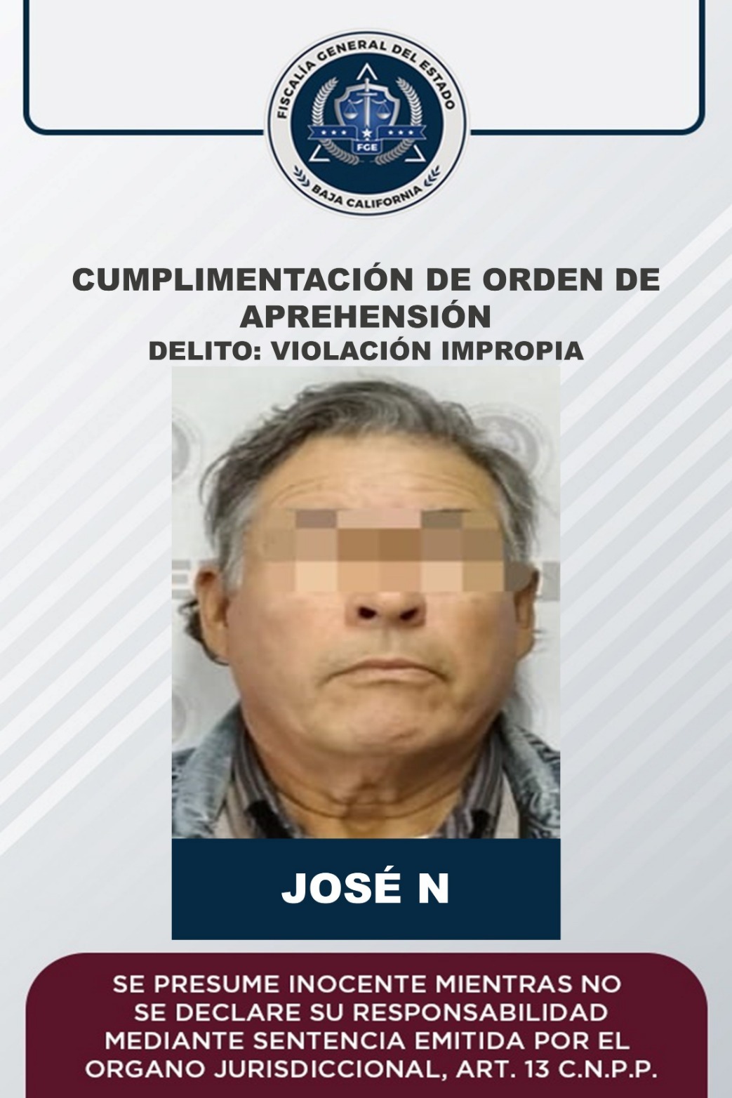 ENSENADA, B.C. La Fiscalía General del Estado (FGE), cumplimentó orden de aprehensión en contra de José “N”, de 70 años edad, por el delito de violación impropia, hecho por el cual quedó recluido a disposición del Juez de Control.