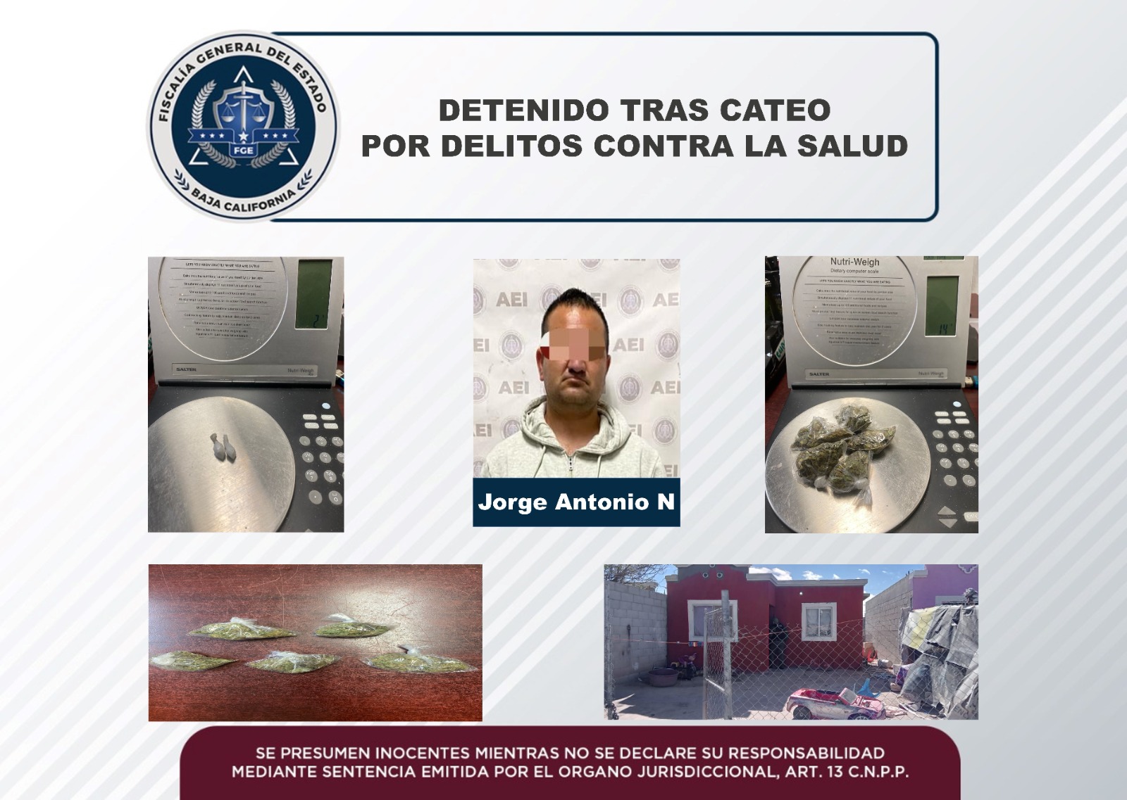 MEXICALI, B.C. Dando seguimiento a denuncias anónimas, el Ministerio Público y elementos de la Agencia Estatal de Investigación de la Fiscalía Especializada en Narcomenudeo, zona Mexicali, cumplimentaron una orden de cateo.