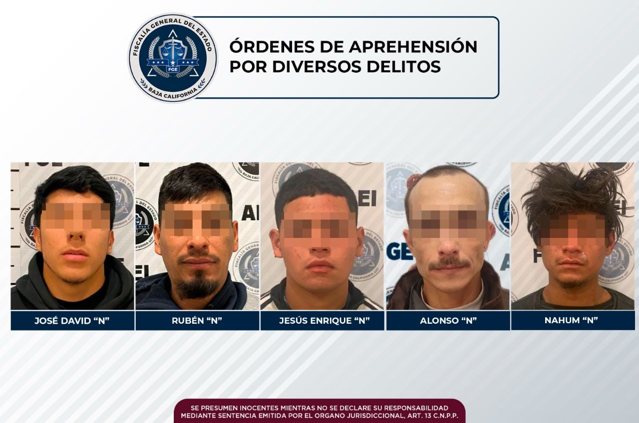 TIJUANA, B.C. Por contar con un mandamiento judicial activo emitido por un Juez de Control, cinco hombres fueron aprehendidos en diferentes diligencias efectuados por elementos de la Agencia Estatal de Investigación (AEI), de la Fiscalía General del Estado (FGE).