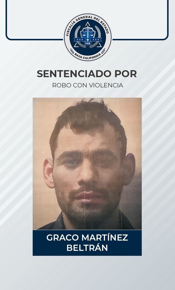 TIJUANA, B.C. La Fiscalía Regional de Tijuana, a través del agente Ministerio Público, obtuvo en un procedimiento abreviado una sentencia de 3 años y 6 meses de prisión contra Graco Martínez Beltrán, por la comisión del delito de robo con violencia, el cual cometió el 19 de mayo de 2022.