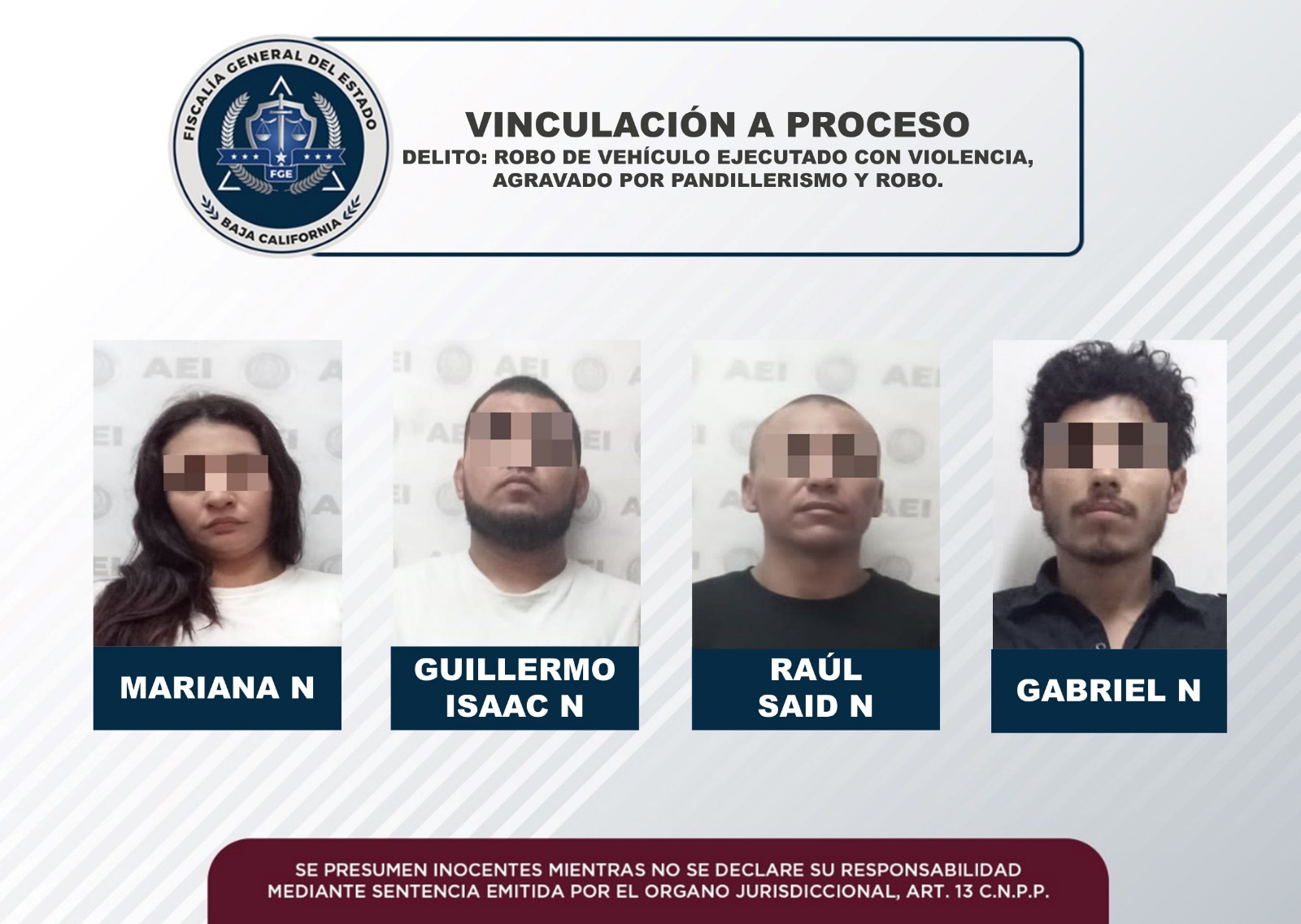 ENSENADA, B.C. La Fiscalía Regional de Ensenada logró auto de vinculación a proceso penal en contra de tres hombres y una mujer, por el delito de robo de vehículo ejecutado con violencia agravado por pandillerismo y robo; ilícitos que habrían cometido el 21 de febrero del año en curso en perjuicio de un automovilista.