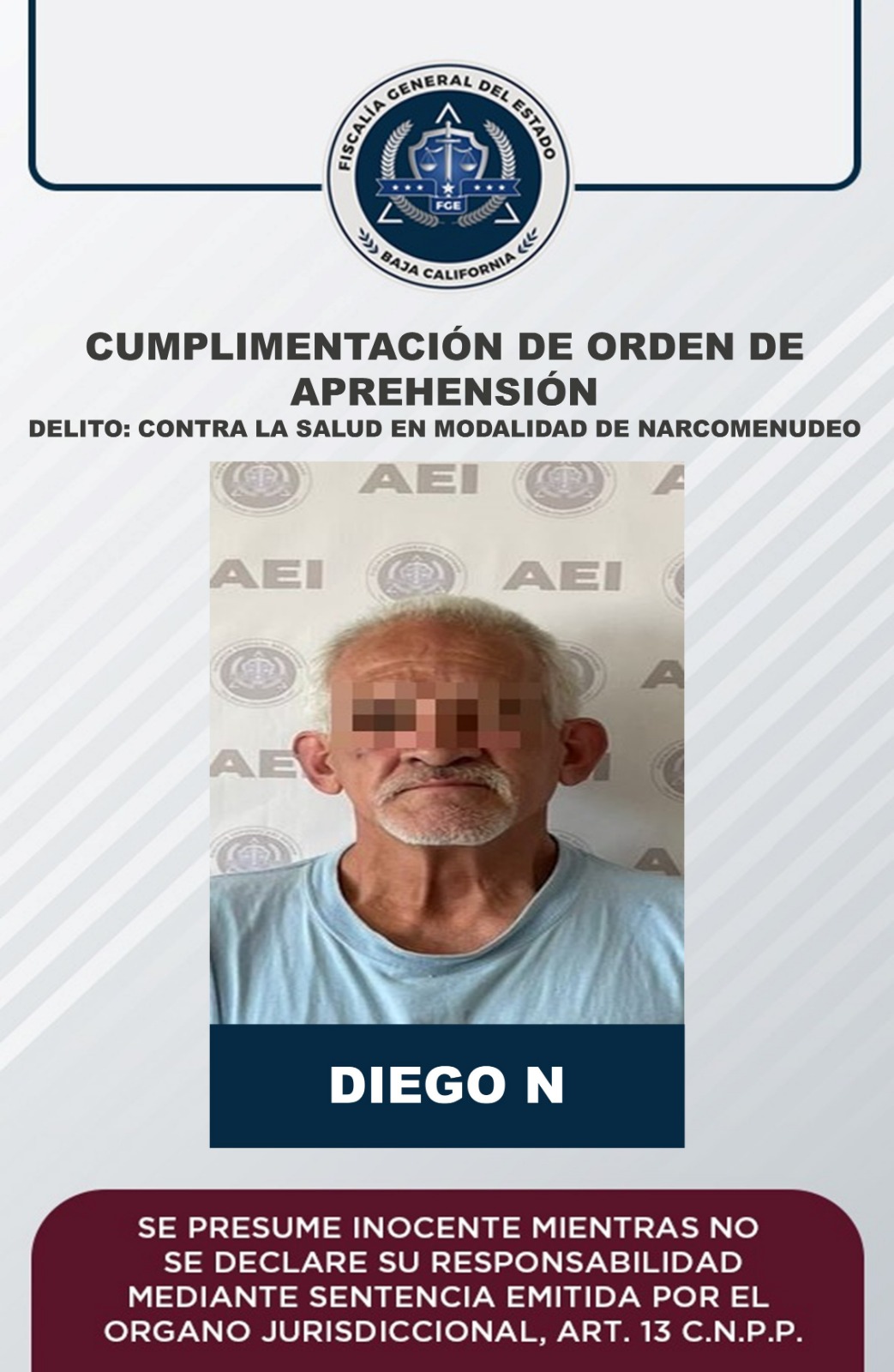 Como resultado del seguimiento a información de gabinete y campo, los elementos estatales de investigación llevaron a cabo la detención de Diego “N”, de 59 años de edad, el 28 de febrero del año en curso, en ensenada.