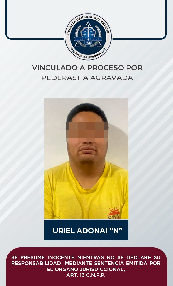 En este sentido, como resultado de una investigación a cargo de la Fiscalía Especializada en Delitos Contra Mujeres por Razón de Género, esta institución de procuración de justicia, presentó ante la autoridad juzgadora al de nombre Uriel Adonai "N", acusado del delito de pederastia agravada, por hechos ocurridos en el año 2018, al interior de un plantel educativo de la ciudad de Playas de Rosarito.