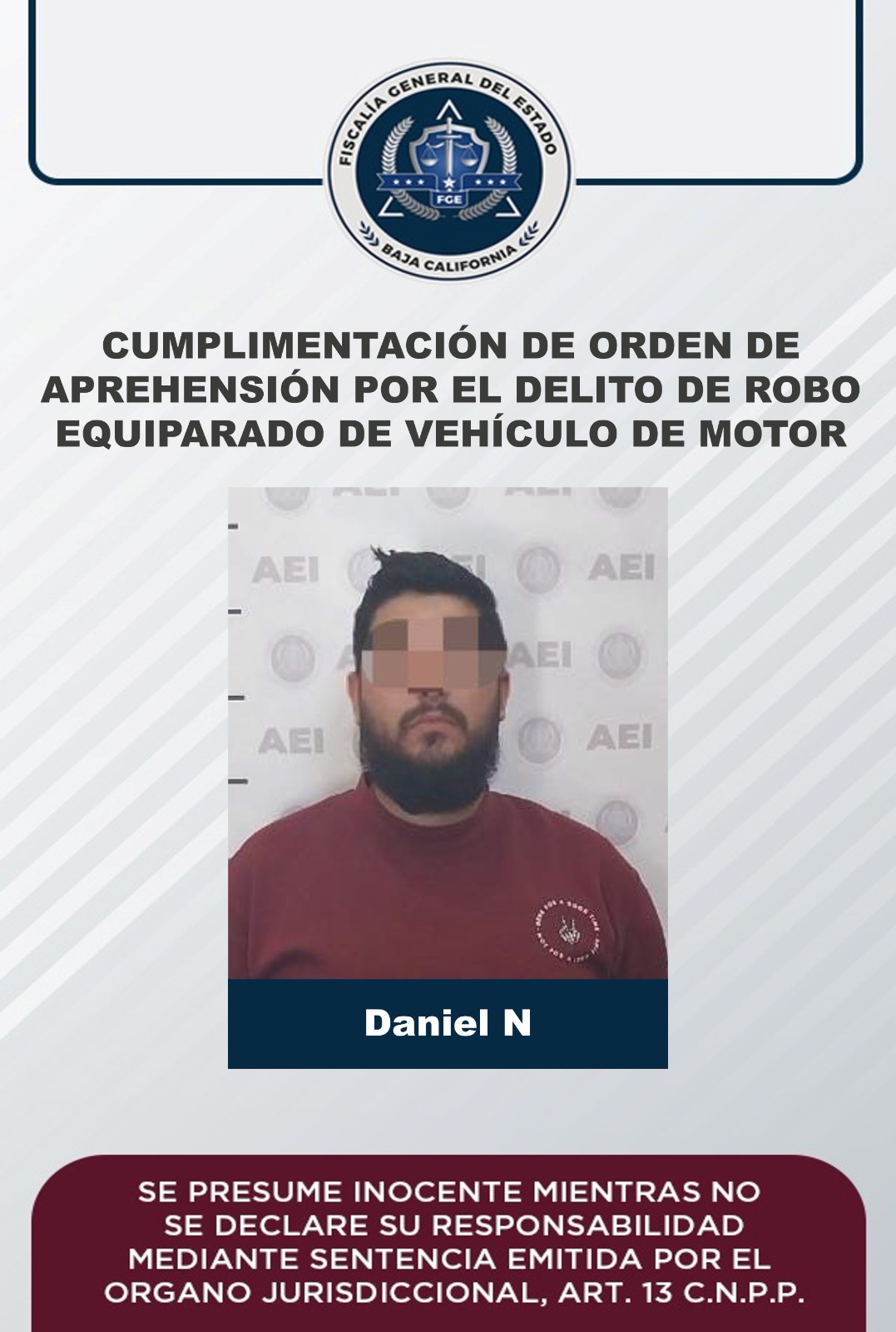 MEXICALI, B.C. La Fiscalía Regional de Mexicali a través de elementos adscritos a la Agencia Estatal de Investigación, cumplimentó una orden de aprehensión en contra de Daniel “N”, por presuntamente cometer el delito de robo de vehículo de motor, en su modalidad de uso de vehículo de motor robado.