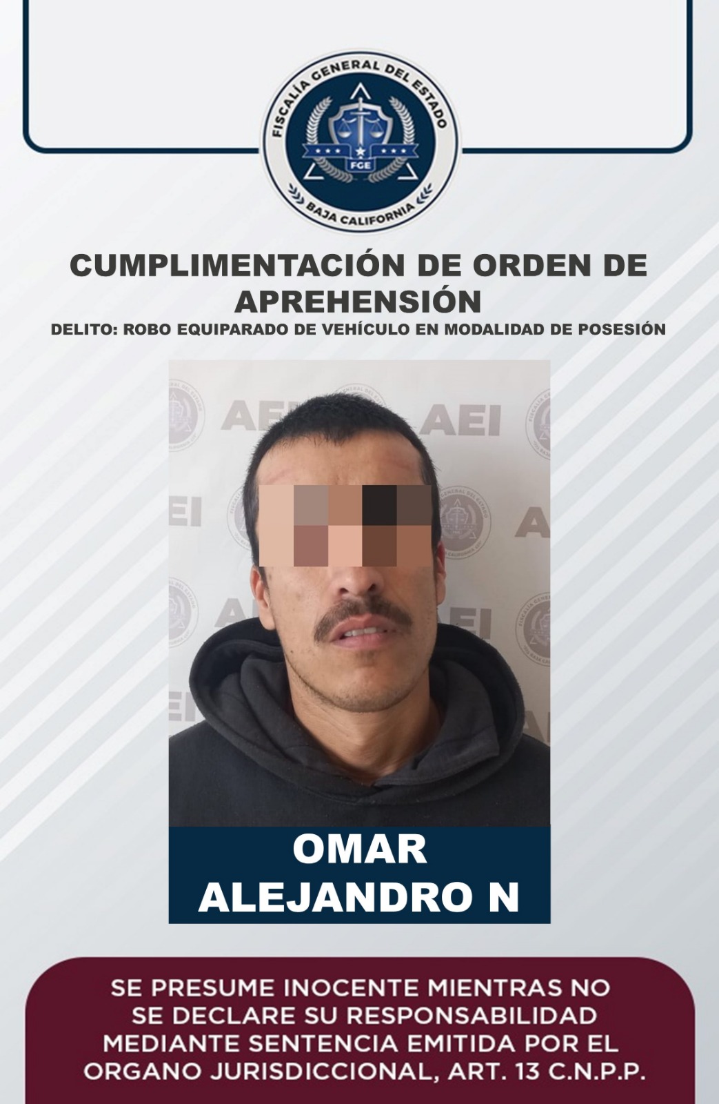 ENSENADA, B.C. Elementos pertenecieron al Grupo Especializado en Aprehensiones, de la Fiscalía General del Estado (FGE), capturaron a Omar Alejandro “N”, por el delito de robo equiparado de vehículo de motor en su modalidad de posesión del vehículo robado.