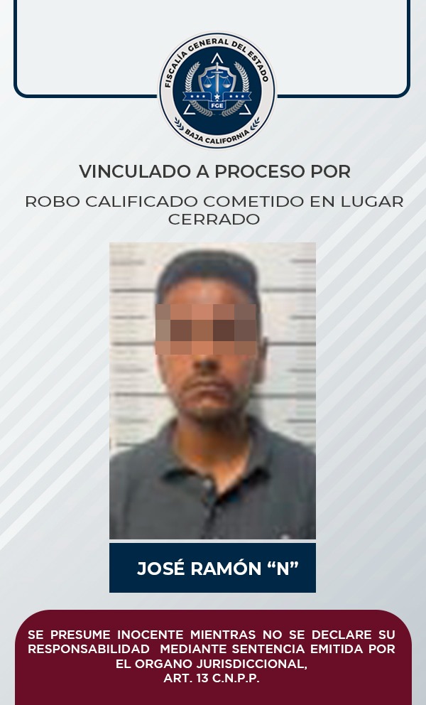 PLAYAS DE ROSARITO, B.C. Como resultado de una investigación realizada por la Fiscalía Regional de Playas de Rosarito, se logró que un sujeto de nombre José Ramón “N”, fuera vinculado a proceso por su probable responsabilidad en el delito de robo calificado cometido a lugar cerrado, ejecutado con violencia.