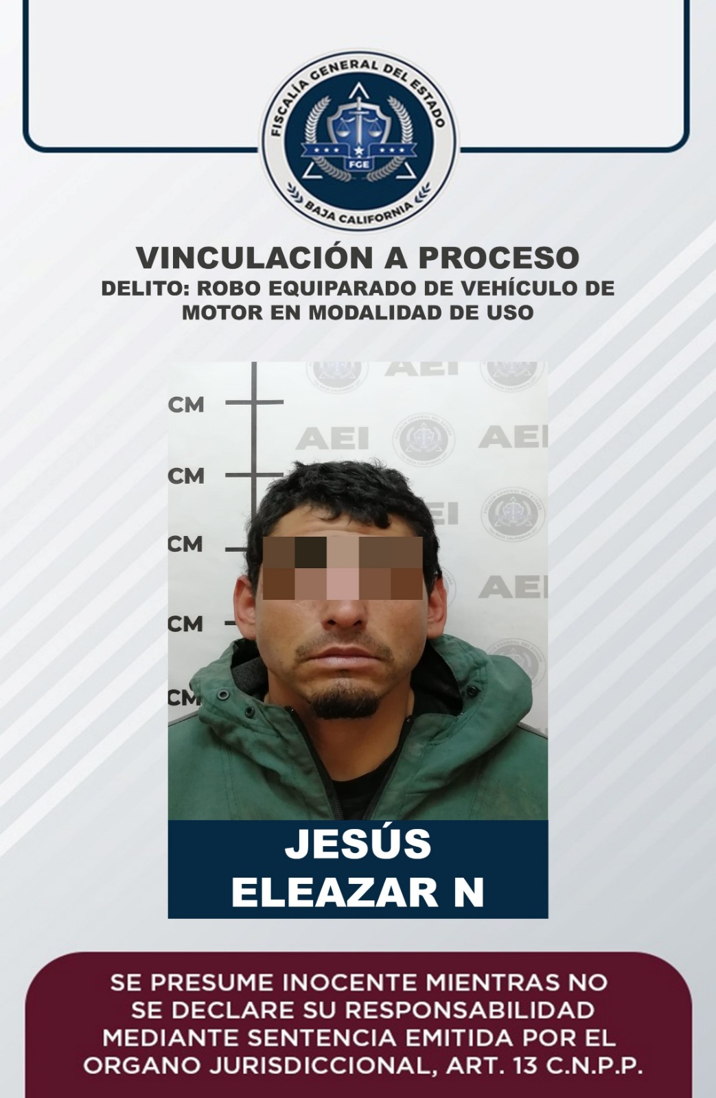ENSENADA, B.C. Por el delito de robo equiparado de vehículo de motor en modalidad de uso, la Fiscalía Regional de Ensenada logró vinculación a proceso en contra de Jesús Eleazar “N”.