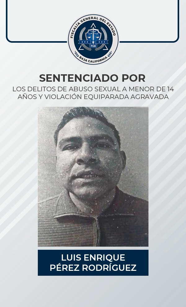 MEXICALI, B.C. La Fiscalía General del Estado, a través de la Fiscalía Especializada en Delitos Contra Mujeres por Razón de Género, logró 21 años de prisión en contra de Luis Enrique Pérez Rodríguez, acusado de los delitos de violación equiparada agravada y abuso sexual a menor de 14 años.