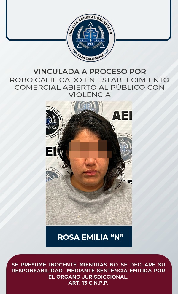 TIJUANA, B.C. Labor de investigación, así como diversos datos de prueba recabados y presentados por el agente del Ministerio Público de la fiscalía Regional de Tijuana ante un Juez de Control, derivó en la vinculación a proceso de rosa Emilia “N”, quien es acusada del delito de robo calificado cometido en establecimiento comercial abierto al público con violencia.