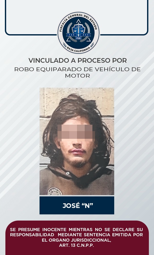 TIJUANA, B.C. Datos de prueba recabados y presentados por el agente del Ministerio Público de la Fiscalía Regional de Tijuana, ante una Juez de Control, fueron determinantes para la obtención de la vinculación a proceso de José “N”, quien es probable responsable del delito de robo equiparado del vehículo de motor en la modalidad de poseer.
