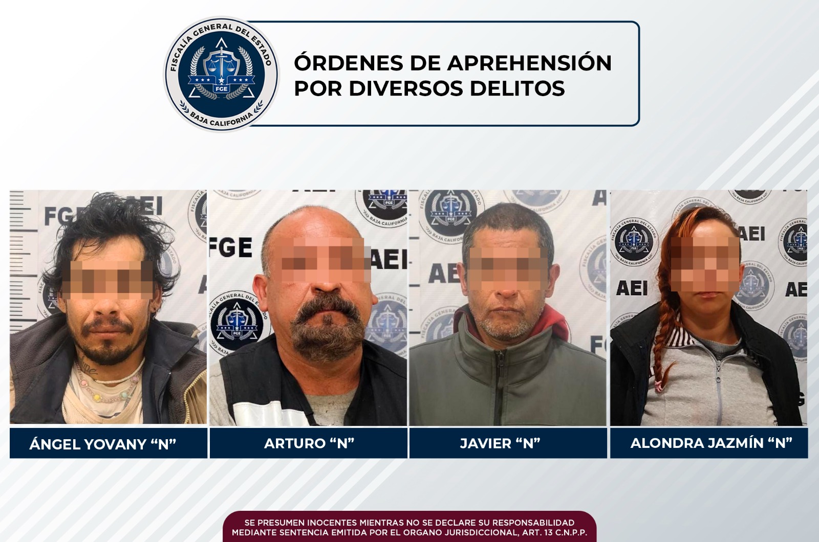 TIJUANA, B.C. Agentes estatales de investigación de la Fiscalía General del Estado (FGE) cumplimentaron, en distintas acciones, cuatro mandamientos judiciales en contra de personas que eran requeridas por un juez.