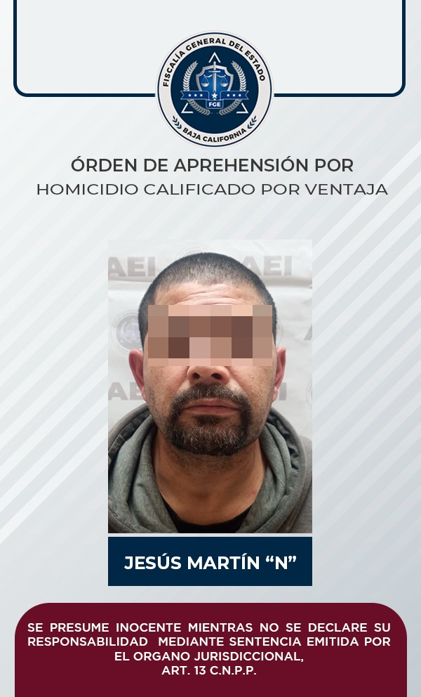 MEXICALI, B.C. La Fiscalía General del Estado (FGE), a través de la Fiscalía Especializada en Delitos Contra la Vida, cumplimentó orden de aprehensión por el delito de homicidio calificado por ventaja, ocurrido en el fraccionamiento El Cóndor.