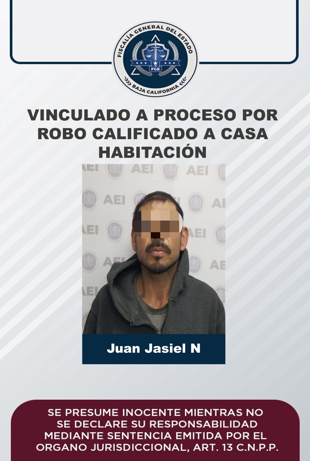 MEXICALI, B.C. La Fiscalía Regional de Mexicali, a través de la Unidad de Investigación Foránea de Ciudad Guadalupe Victoria, logró la vinculación a proceso de Juan Jasiel “N”, por presuntamente cometer el delito de robo calificado a casa habitación.