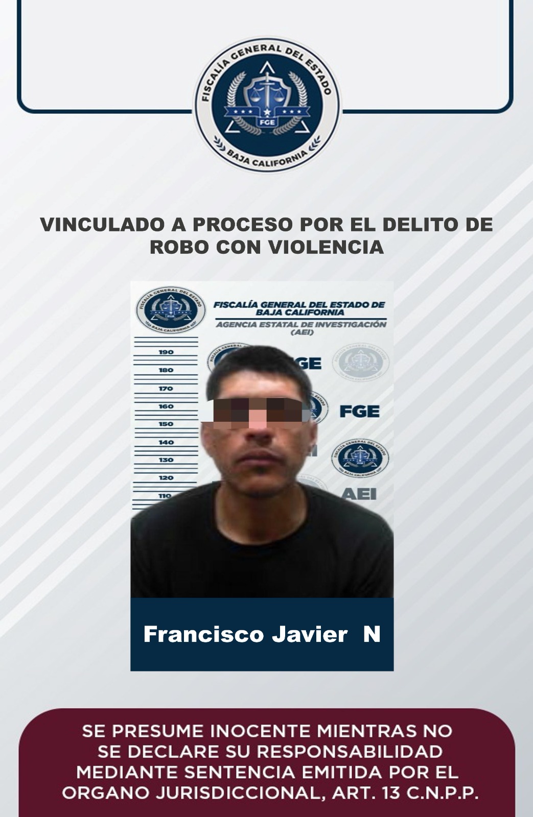 MEXICALI, B.C. 9 DE MARZO DE 2023.- La Fiscalía Regional de Mexicali, a través de la Unidad de Investigación de Delitos con Detenido Poniente, obtuvo la vinculación a proceso en contra de Francisco Javier “N” por presuntamente cometer el delito de robo con violencia.