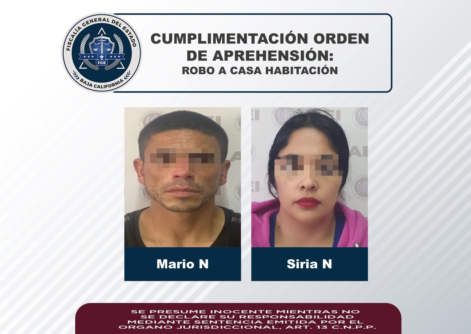 ENSENADA, B.C. Por estar presuntamente involucrados en robos a casa habitación en el puerto, agentes de la Fiscalía General del Estado (FGE), cumplimentaron las órdenes de aprehensión en contra de Mario “N” y Siria “N”.