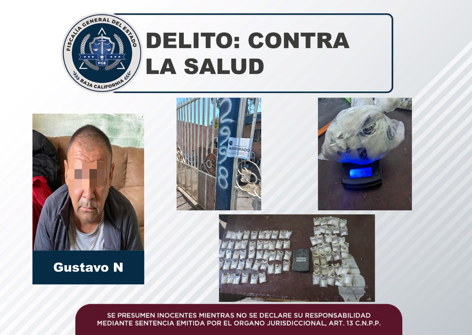 MEXICALI, B.C. La Fiscalía General del Estado a través de las acciones de la Fiscalía Especializada en Narcomenudeo Zona Mexicali, en seguimiento a la investigación de las denuncias por este ilícito, ejecutó un cateo en una vivienda, logrando asegurar a Gustavo “N” de 53 años de edad.