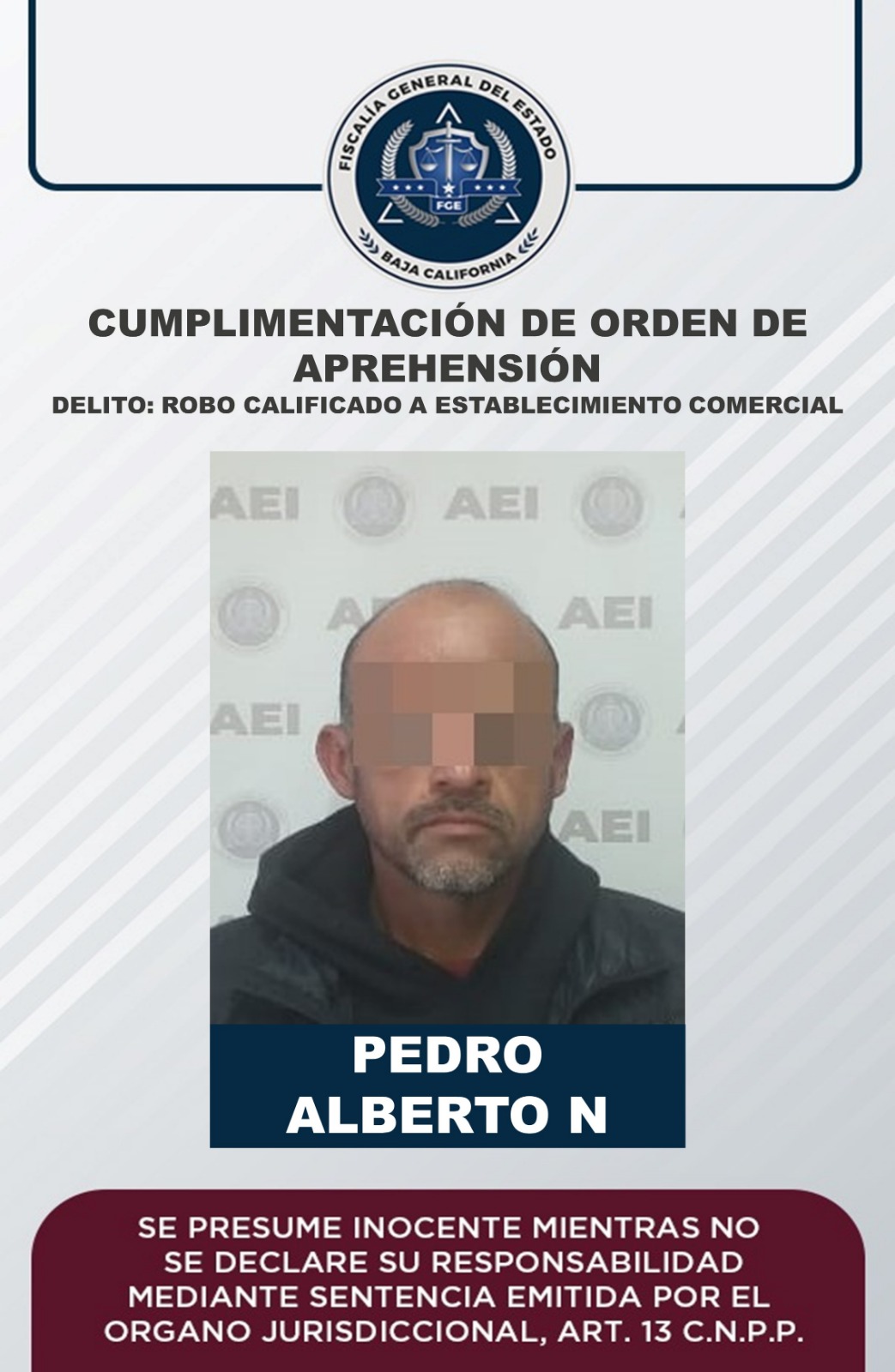 ENSENADA, B.C. La Fiscalía General del Estado (FGE), cumplimentó una orden de aprehensión contra Pedro Alberto “N”, de 43 años de edad, por el delito de robo calificado a establecimiento comercial abierto al público.