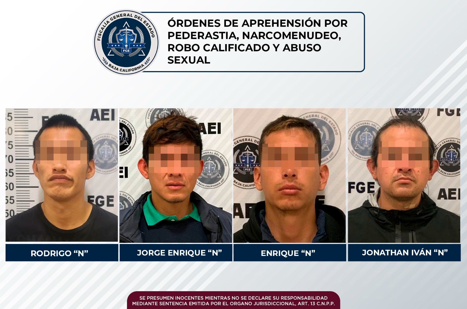 TIJUANA, B.C. Elementos de la Agencia Estatal de Investigación (AEI) de la Fiscalía General del Estado, realizaron diversas diligencias que derivaron en la cumplimentación de órdenes de aprehensión por los delitos de pederastia, narcomenudeo, robo calificado y abuso sexual.
