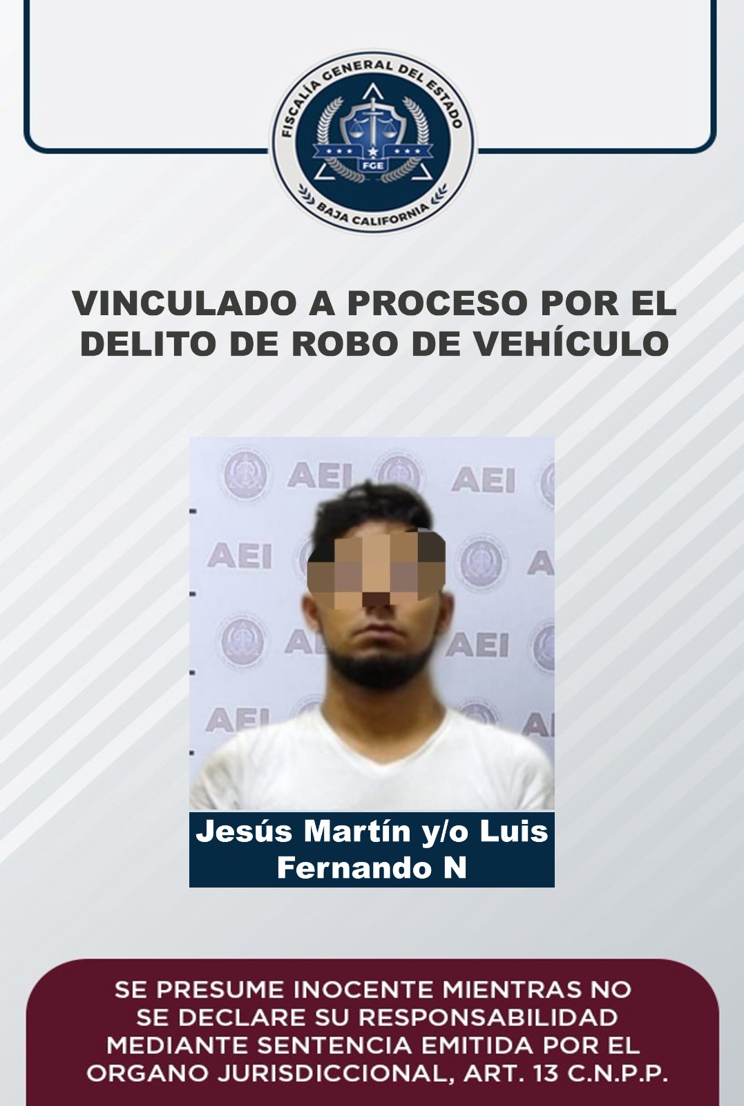 MEXICALI, B.C. - La Fiscalía Regional de Mexicali, a través de la Unidad de Investigación de Delitos Contra Robo de Vehículos, obtuvo la vinculación a proceso en contra de Jesús Martín “N” y/o Luis Fernando “N”.