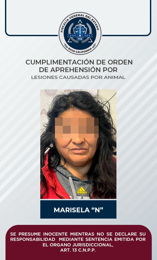 PLAYAS DE ROSARITO, B.C. La Fiscalía General del Estado cumplimentó orden de aprehensión contra una mujer que responde de nombre de Marisela “N”, señalada del delito de lesiones causadas por animal.
